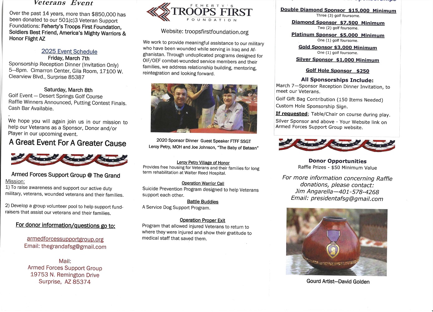 The Armed Forces Support Group began with the purpose of helping veterans returning from Operation Iraqi Freedom. What started as a single item auction evolved into a golf tournament/raffle that has proudly donated over $921,000 to 501(c)(3) foundations that support veterans and their families in their healing journey. From its humble beginning, through the leadership and perseverance of its founder, Barry Curseaden, a non-veteran, the organization has grown to what it is today.